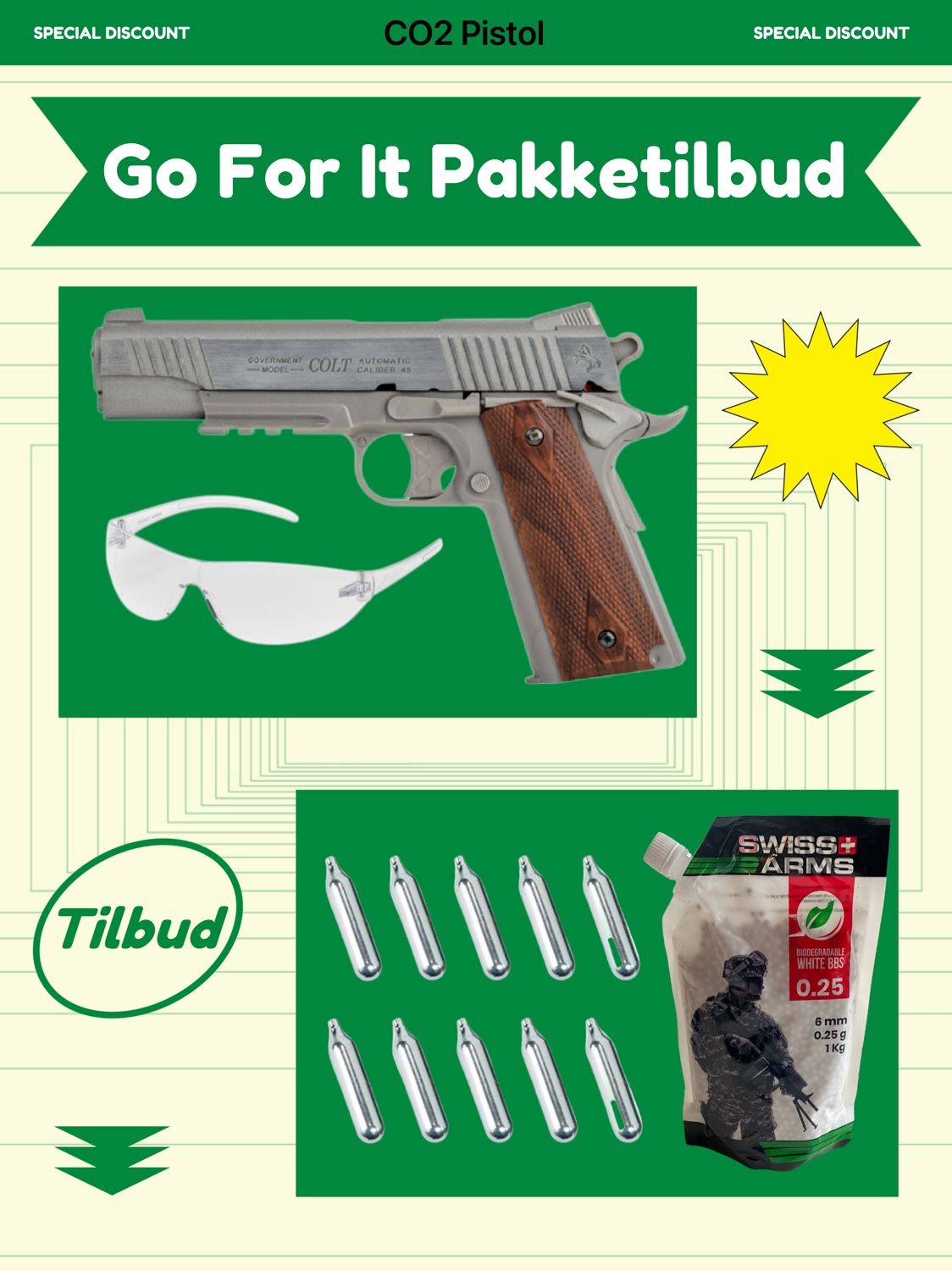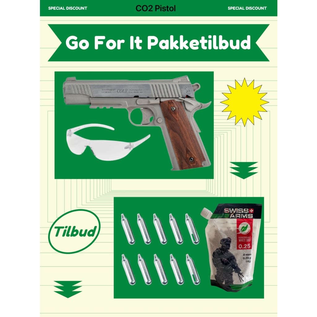 Airsoft CO2NBB pistol Colt 1911 “GO FOR IT” pakke tilbud