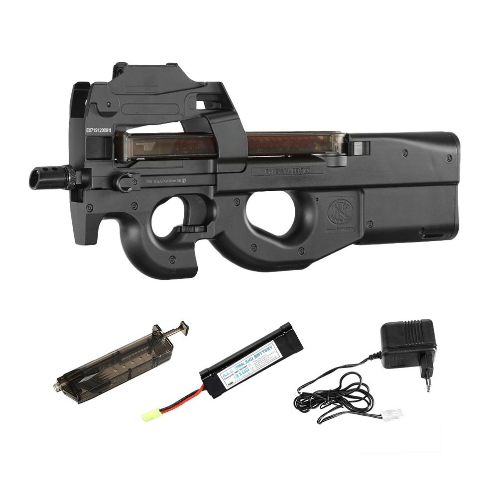 Airsoft FN Herstal P90 Sort incl. batteri, lader og rødpunkt sigte