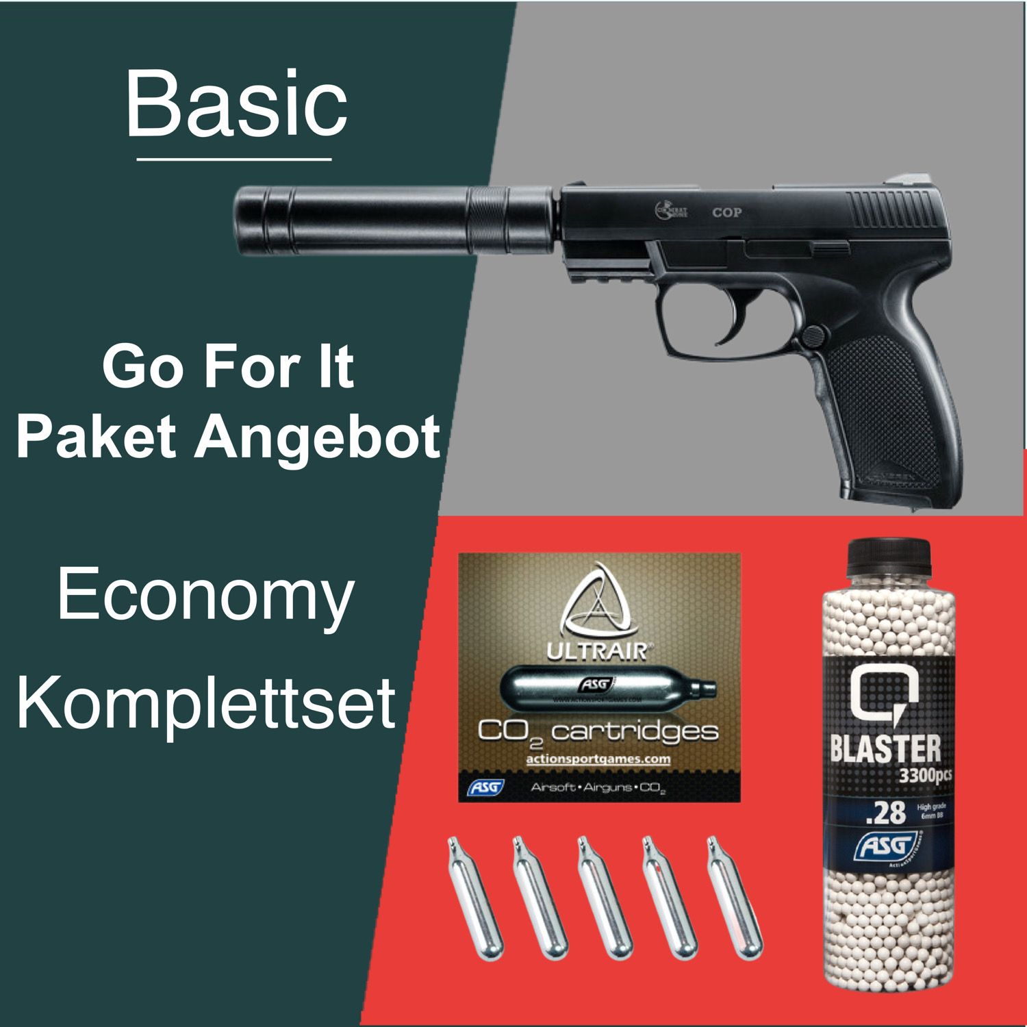 Basis Økonomi Go for it Airsoft tilbud, CO2 pistol Combat Zone COP SK med lyddæmper.