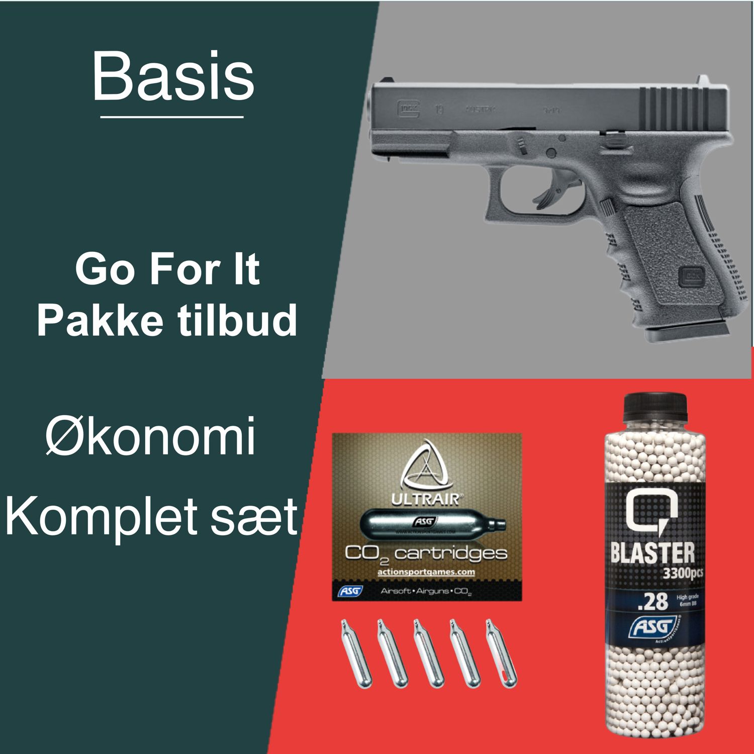 Basis Økonomi Go for it pakke tilbud, Glock 19, Gen 3 CO2 pistol, uden blow back