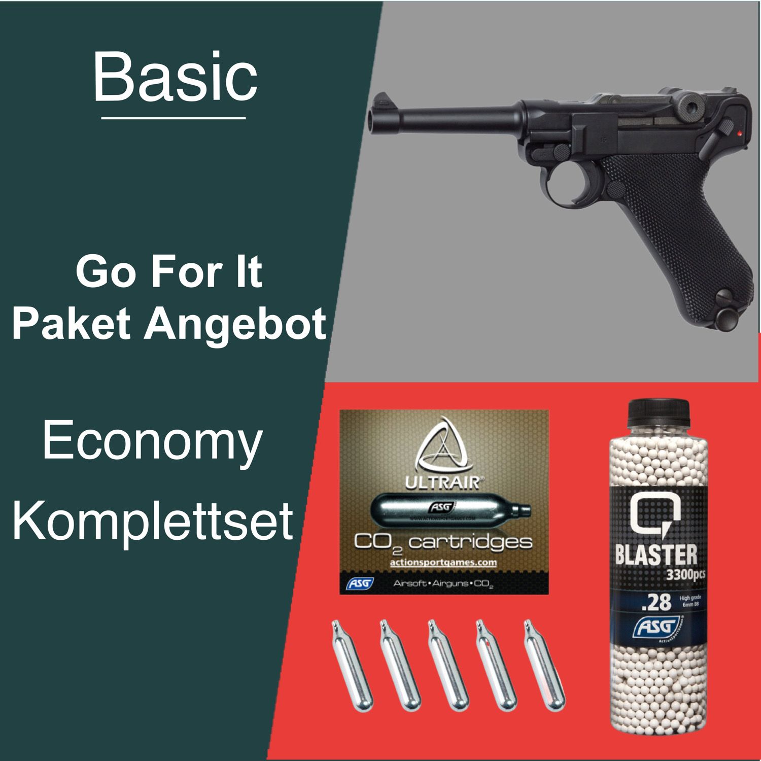 Go for it Pakke tilbud, Softgun CO2 pistol CO2 Pistol Legends P08, fuld metal, uden blow back.