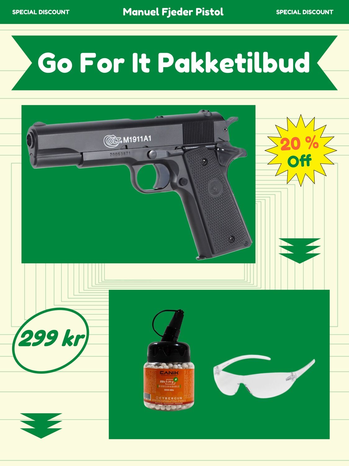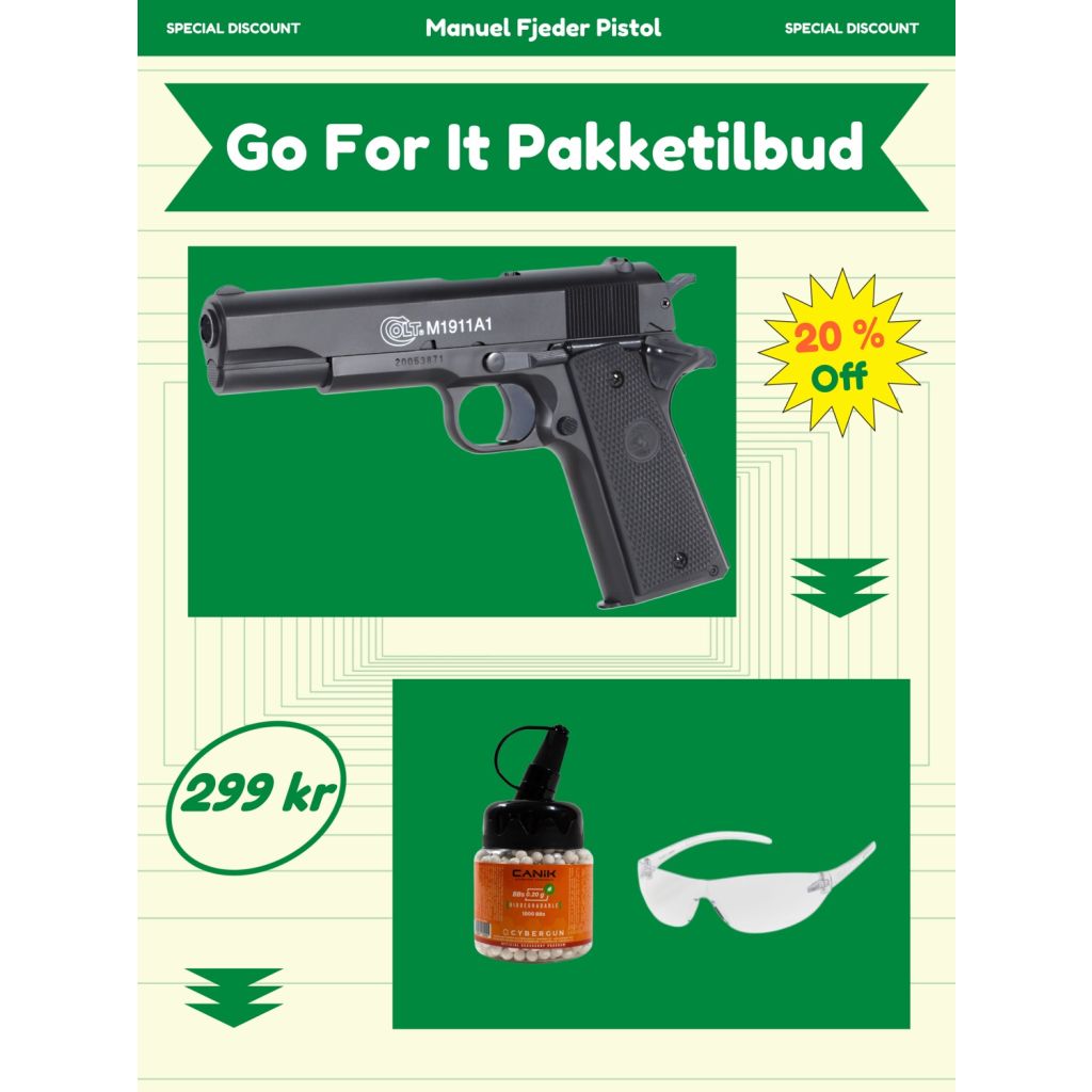 Softgun manuel pistol Colt 1911 A1 ”GO FOR IT” pakke tilbud.