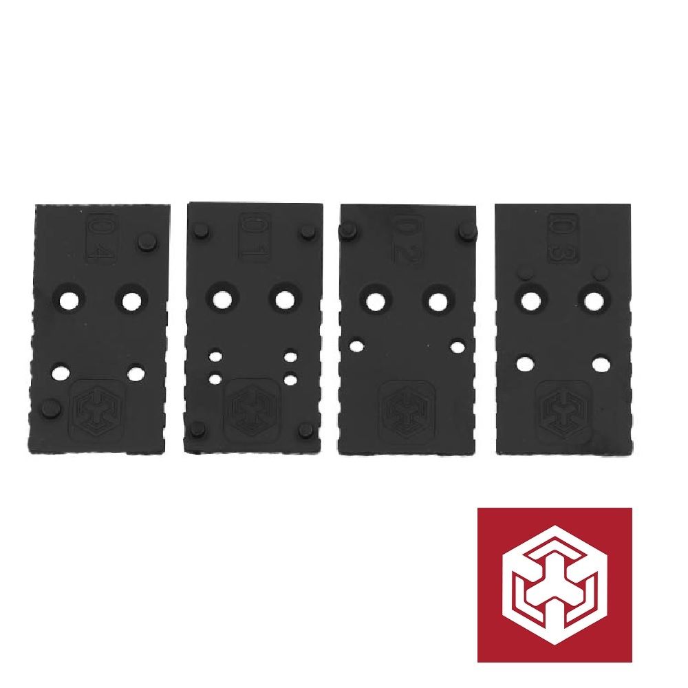 De 4 medfølgende monteringsplader til rødpunktsigte har forskellige hulmønstre.